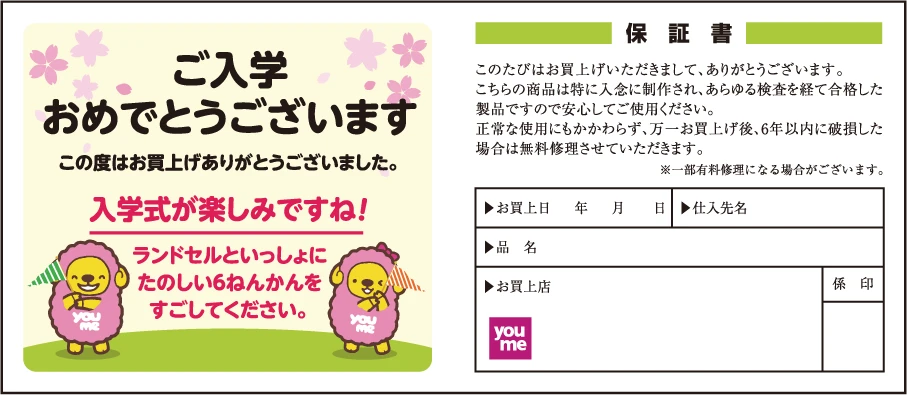 正常な使用にもかかわらず、ランドセルが万が一故障した場合は、責任をもって修理いたします。修理期間中は、貸出用ランドセルもご用意します。