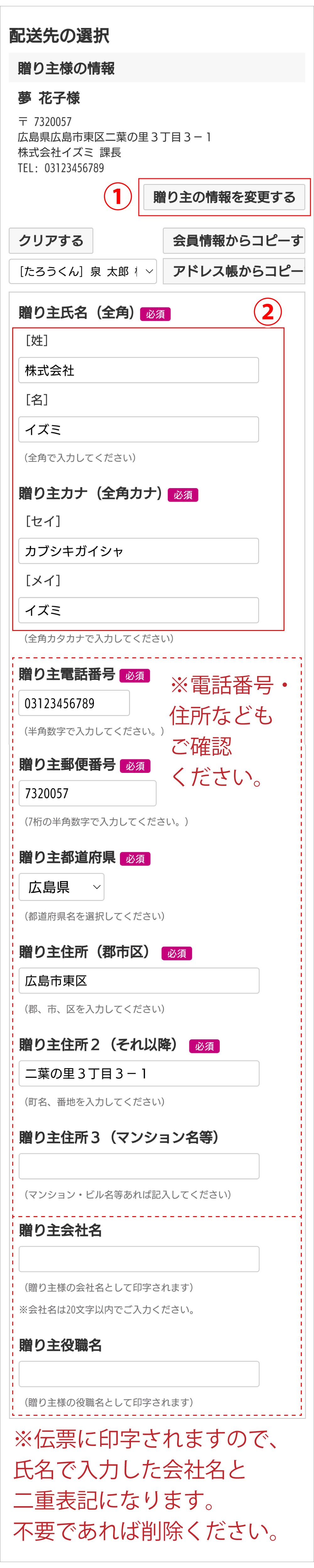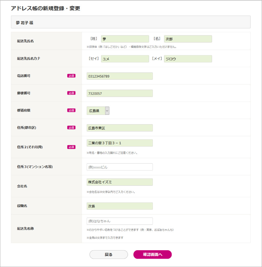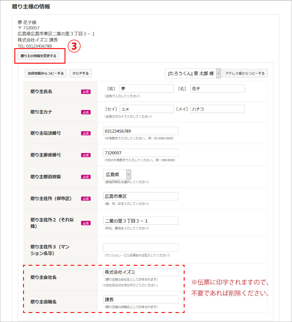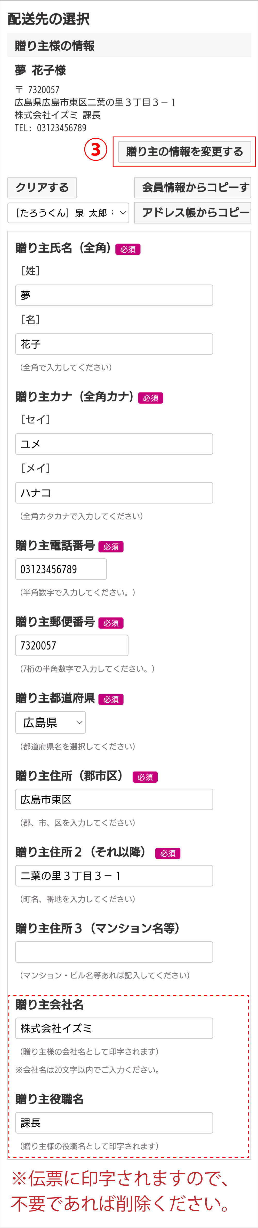 会社名・役職名を登録すると、お中元やお歳暮などを送付する際、配送伝票に社名などが印字されます。