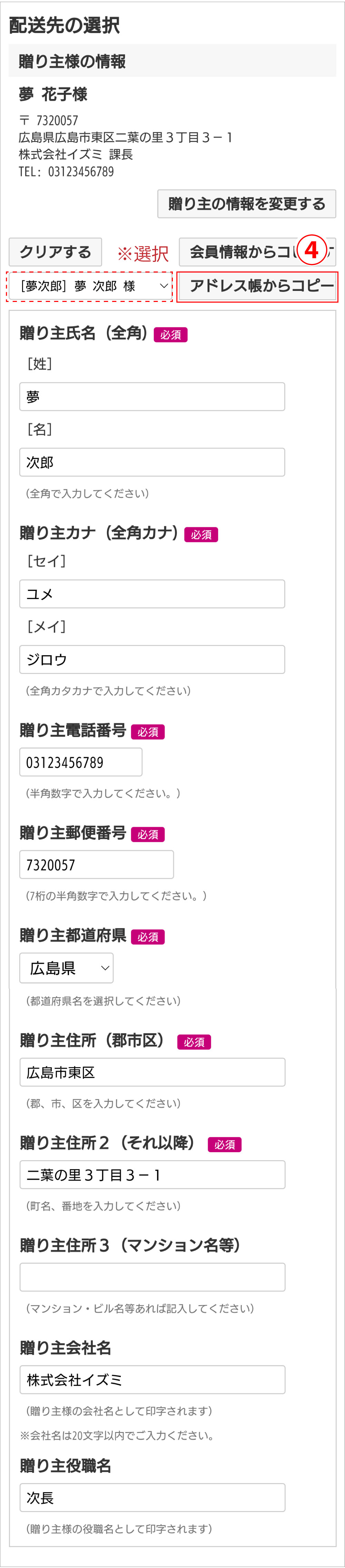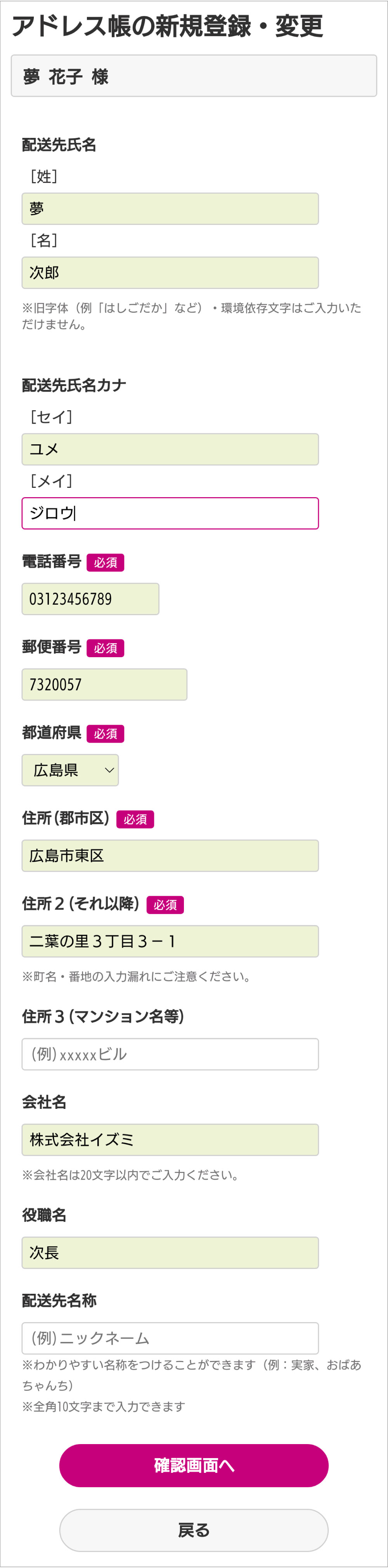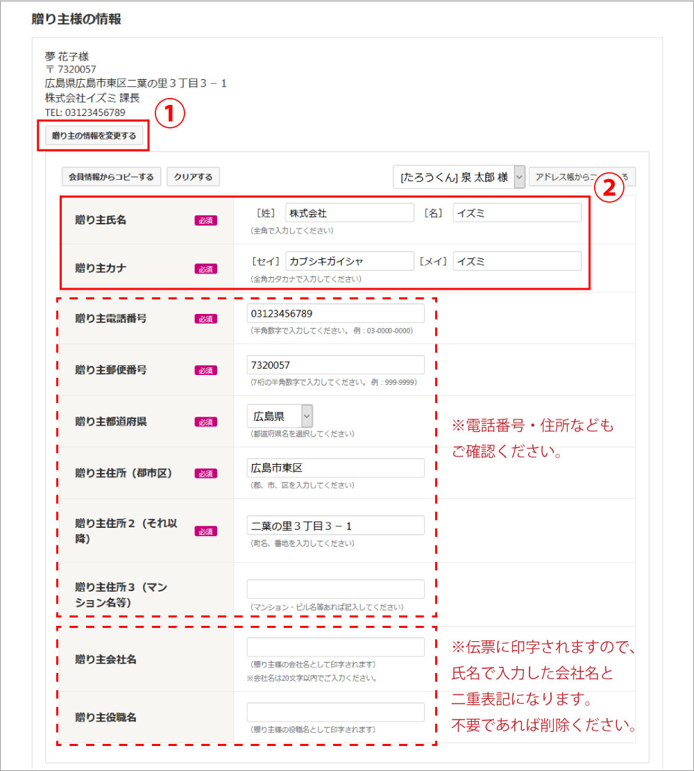 会社名・役職名を登録すると、お中元やお歳暮などを送付する際、配送伝票に社名などが印字されます。