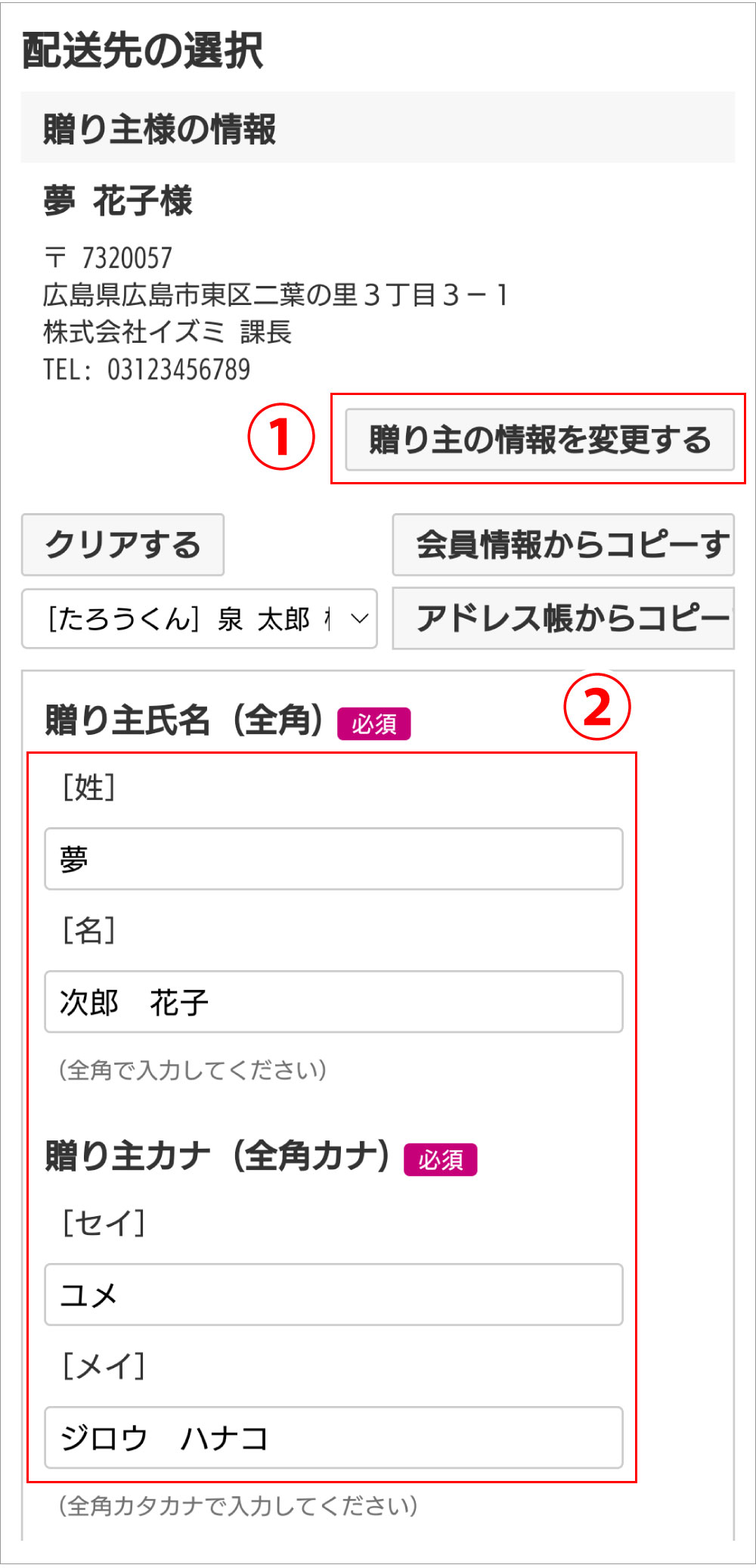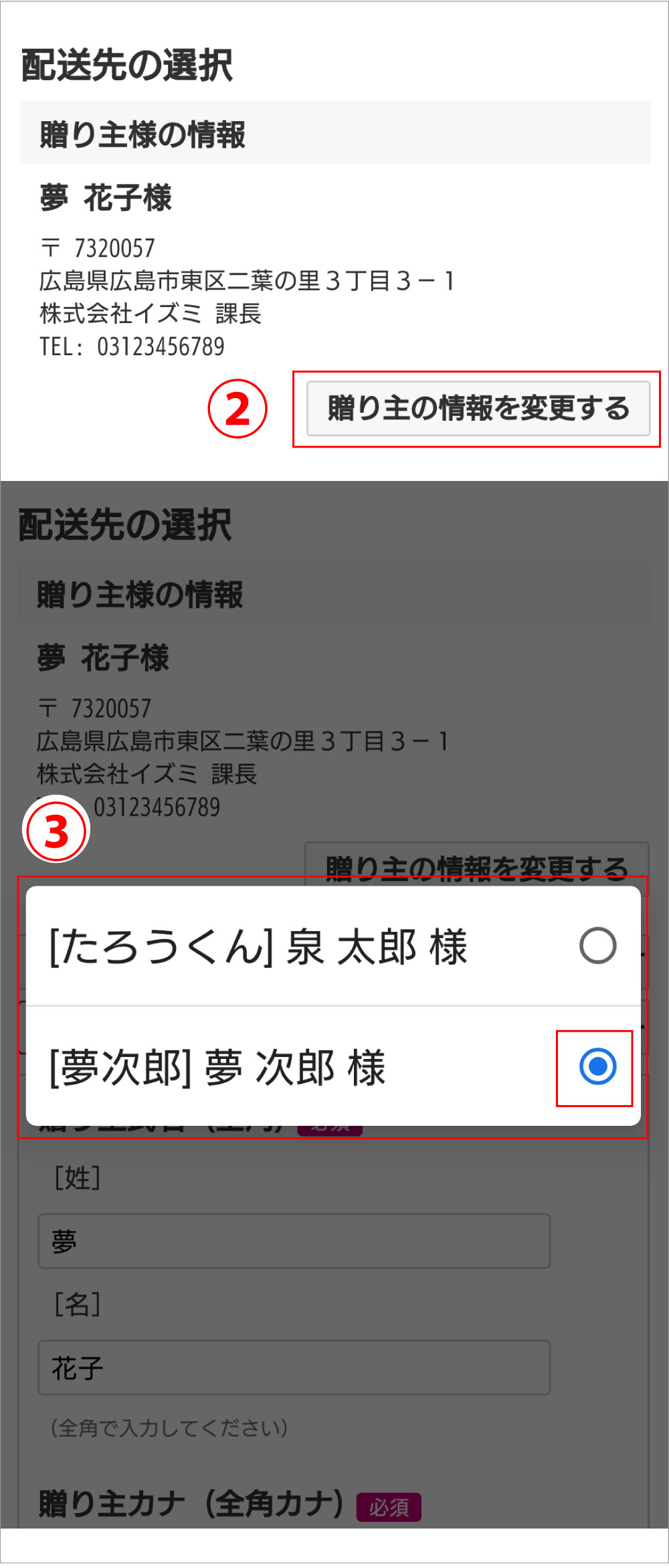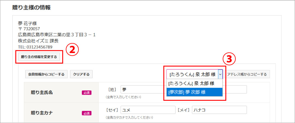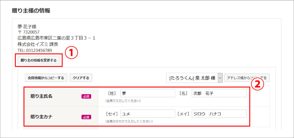 贈り主を別々のお名前でお贈りしたい場合(例:贈り主A様、贈り主B様)、贈り主A様のご注文を注文完了まで進めていただき、贈り主B様のご注文を進めていただきます。